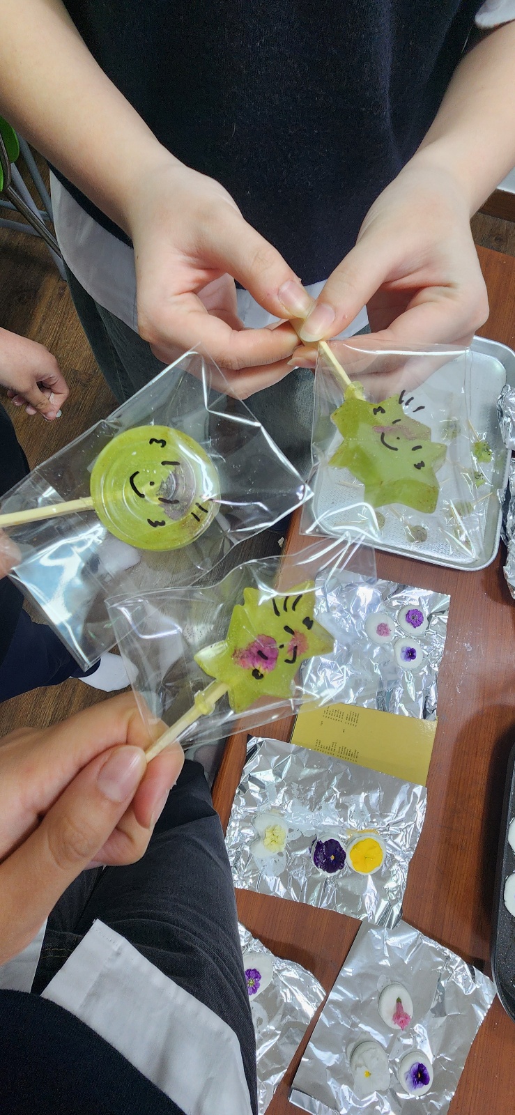 사탕이 완전히 녹기전에 꺼내어 위에 생화 꽃을 올리고 나무꼬지를 가운데에 넣는다.
